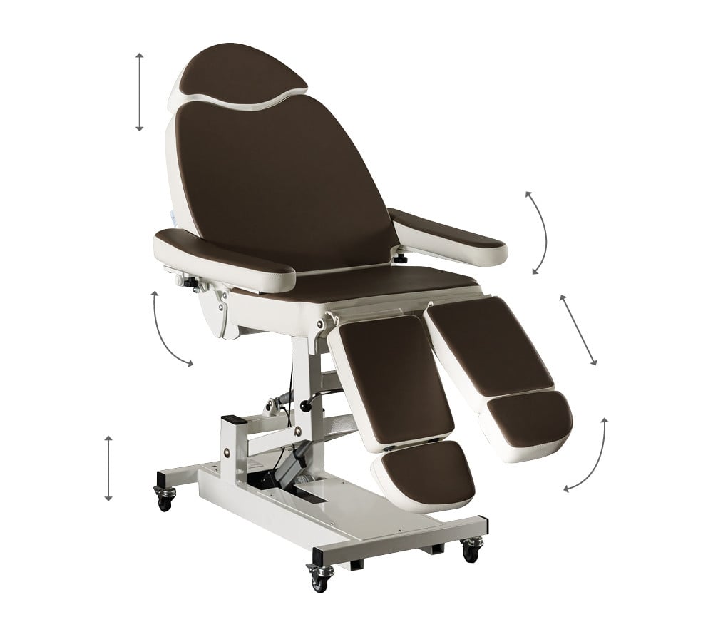 Le fauteuil Dallas est électrique et est idéal pour différents types de soins de beauté. Il est équipé d'un réglage en hauteur du siège grâce à une pédale électrique, l'angle du siège et du dossier peut être réglé séparément par deux pédales d'accélérateur séparées, il dispose également de deux repose-jambes séparés et indépendants, réglables manuellement. La chaise est également équipée de deux accoudoirs entièrement pivotants, à utiliser dans toutes les positions, assise et couchée. Le repose-jambes et l'appui-tête sont réglables en longueur et en hauteur pour un confort total du client.