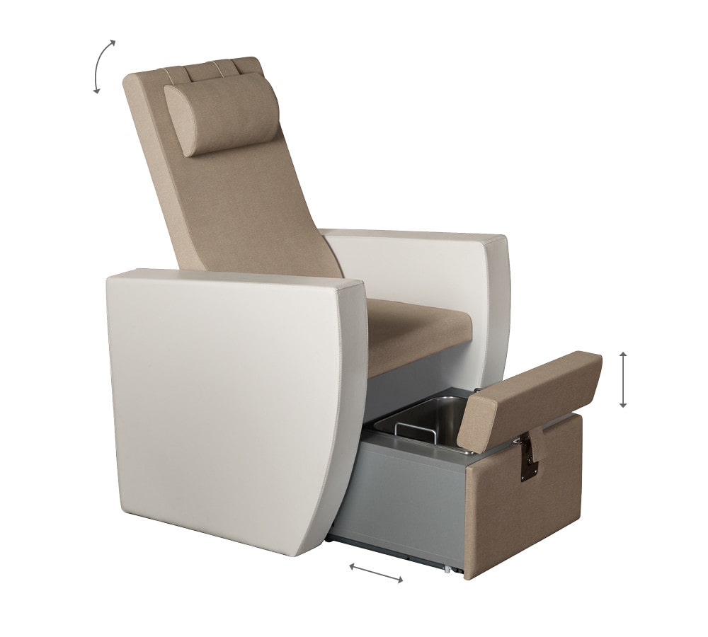 Pacific Podo - Suite au succès incroyable du fauteuil relax Pacific, Medical & Beauty présente Pacific Podo offrant une plus grande fonctionnalité avec le même style! Comptant sur le confort incroyable du fauteuil Pacific Relax, avec dossier, assise et accoudoirs rembourrés, Pacific Podo a sous lui un tiroir caché avec un panneau avant rembourré qui peut être ouvert, à l'intérieur duquel se trouve une cuve amovible en acier inoxydable pour les soins de pédicure . Attaché au panneau avant est un repose-jambes rembourré réglable en hauteur qui offre une solution simple et fonctionnelle pour les traitements de pédicure dans le centre de beauté. Le mécanisme d'inclinaison manuelle du dossier ajoute du confort pour le client. Pacific Podo est disponible dans un choix de couleurs Skai, mono ou bicolore, sans frais supplémentaires.